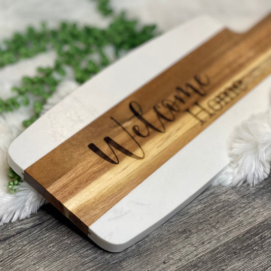 Wood and Marble Serving Board, Personalized charcuterie board, Custom Housewarming gift, Personalized Realtor Closing gifts, New Home gift