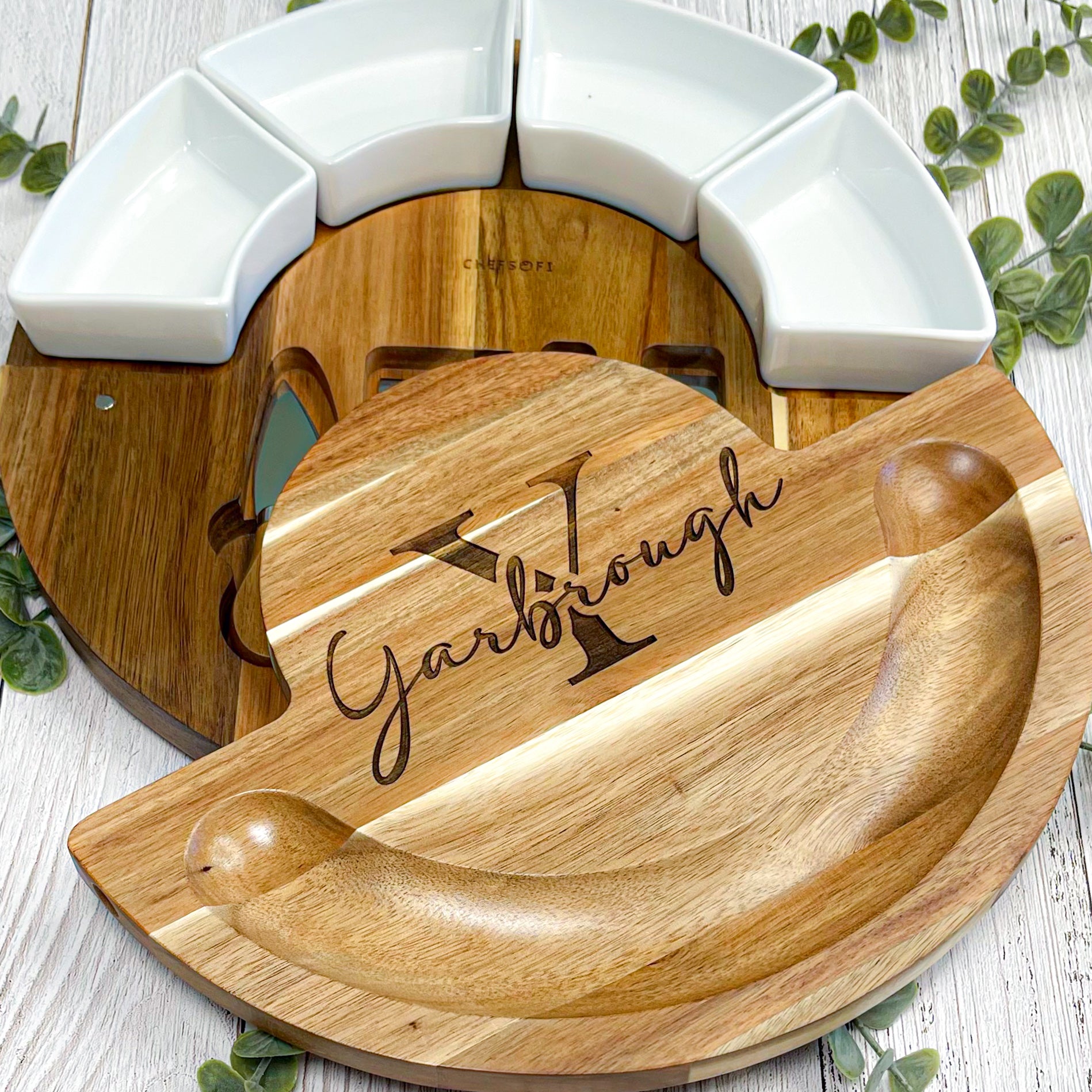Our custom wood and marble serving trays are laser engraved in house using the utmost care and attention to detail. What an elegant way to commemorate new beginnings or special occasions and display your family name. Each board measures 13” round and includes four ramekins as well as four cheese knives. Personalize your board with a family name or any one of the other 4 options. This is the perfect gift for new home buyers and newlyweds. Upgrade to two sided and make a statement by adding your company logo or personalized message to the back.